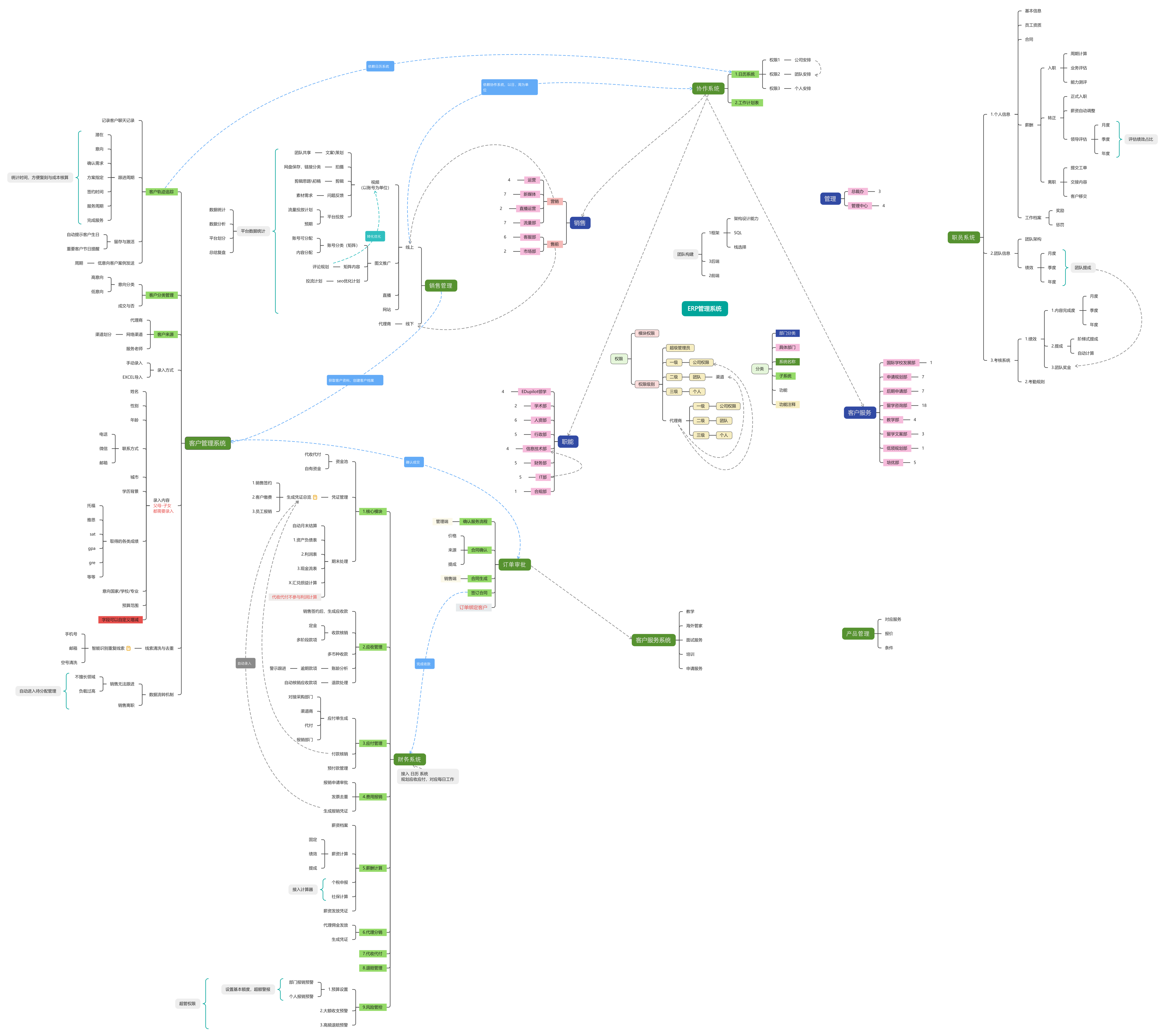 - 权限管理系统:公司权限分配、部门权限分配、每个员工的权限分配、代理商权限分配